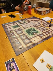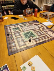 Na het eten legde Alexander Nuns on the Run uit โ€” een hidden movement game waarin รฉรฉn speler de nonnen bestuurt en de anderen stiekem door het klooster proberen te sluipen.