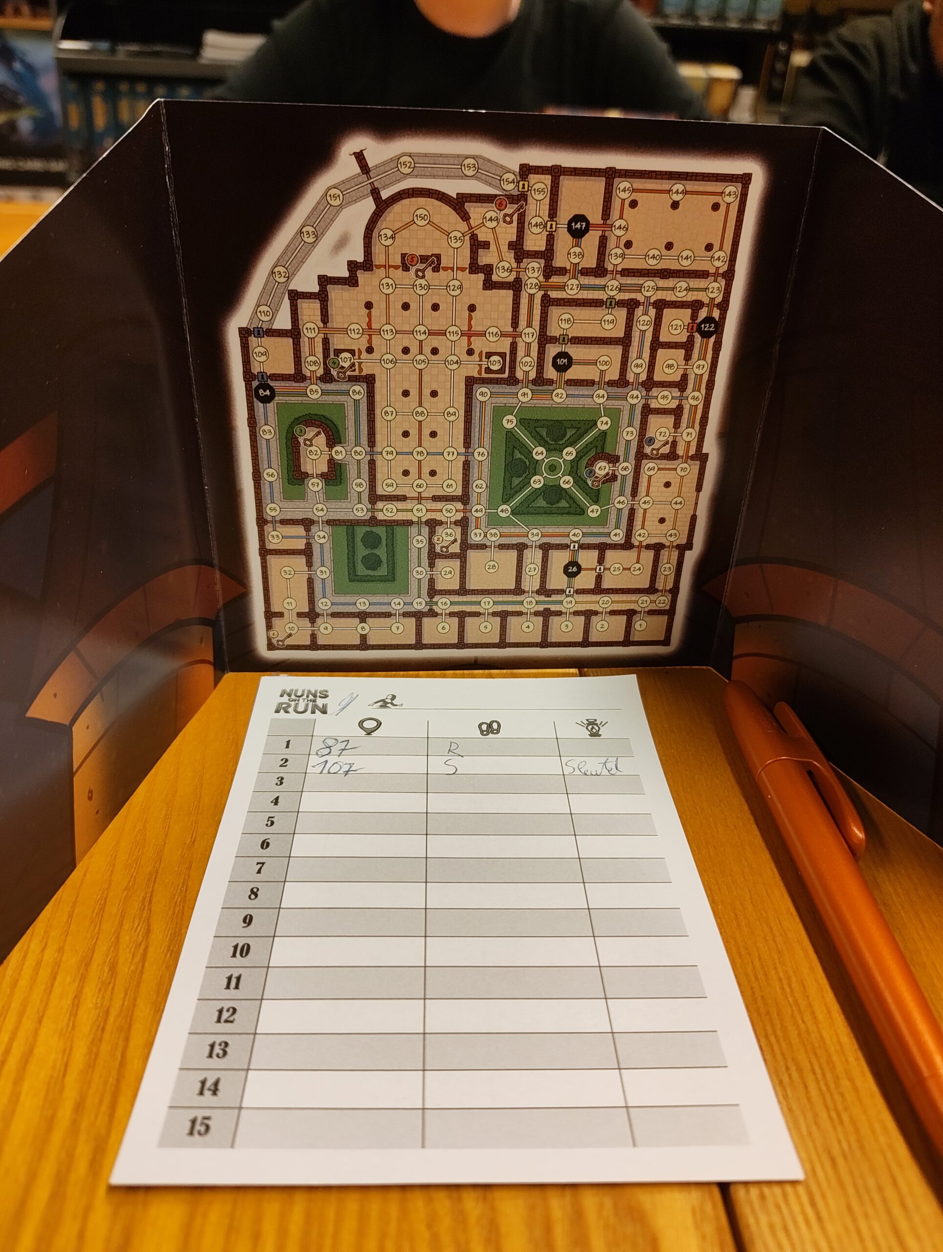 Na het eten legde Alexander Nuns on the Run uit โ€” een hidden movement game waarin รฉรฉn speler de nonnen bestuurt en de anderen stiekem door het klooster proberen te sluipen.